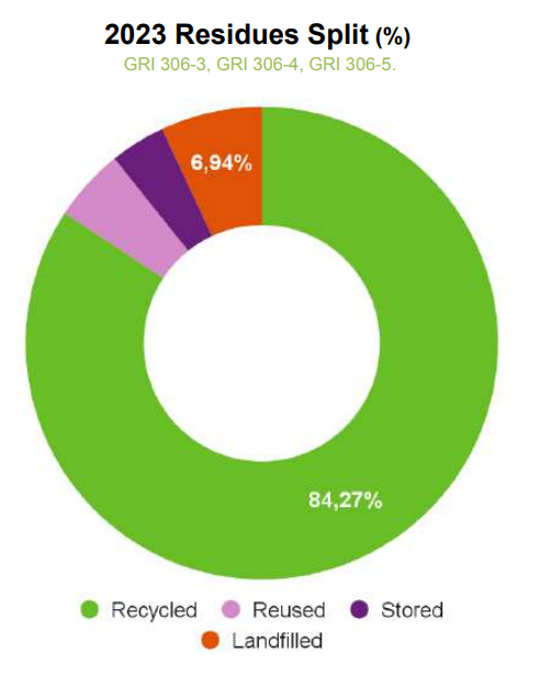 On our path to becoming a zero-waste (for landfill) company, we report that we currently send just 6.9% of our by-products to the landfill, with the remainder being reused, recycled or stored for future recycling. As a result, our waste recovery ratio now stands at 93.1%.